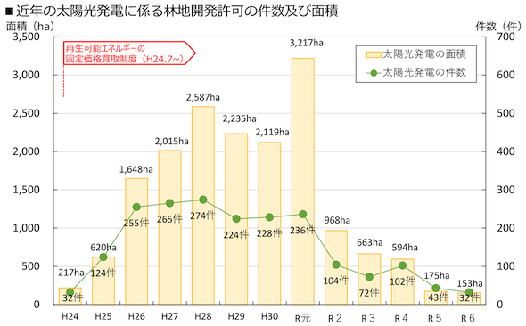 太陽光発電設備の設置に係る林地開発許可の件数及び面積は、平成24年のFIT制度開始以降急増し、令和6年度までに累計で1,991件・17,211haの太陽光発電設備の設置に係る林地開発が許可された。近年は件数・面積のいずれも大きく減少しており、令和6年度の許可は32件・153haと、面積比で令和元年の4.8%まで減少している。
