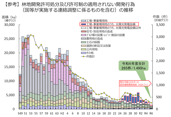 太陽光発電以外の開発目的も含めた全体の林地開発許可処分及び許可制の適用されない開発行為(国等が実施する連絡調整に係るものを含む)の推移を見ると、昭和50年代には「農用地の造成」、昭和60年代には「ゴルフ場・スキー場」の開発が多数あったことが分かる。開発行為全体が減少傾向にある中で、平成24年以降に太陽光発電目的の林地開発が急速に増加したが、減少も速かったことが見て取れる。