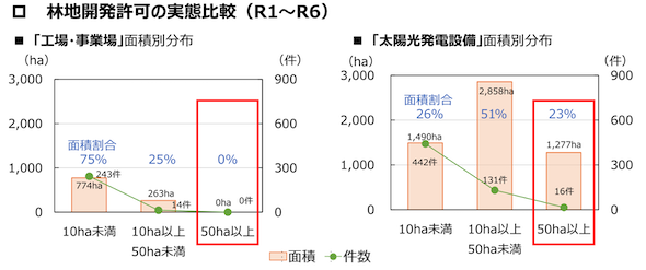 「工場・事業場」は主な面積規模が10ha以下であり、50ha以上の開発は無いのに対して、「太陽光発電設備」は50ha以上が16件・1,277ha(面積割合23%)であり、太陽光発電では従来想定されていなかった大面積の開発が多いことが明らかとなった。