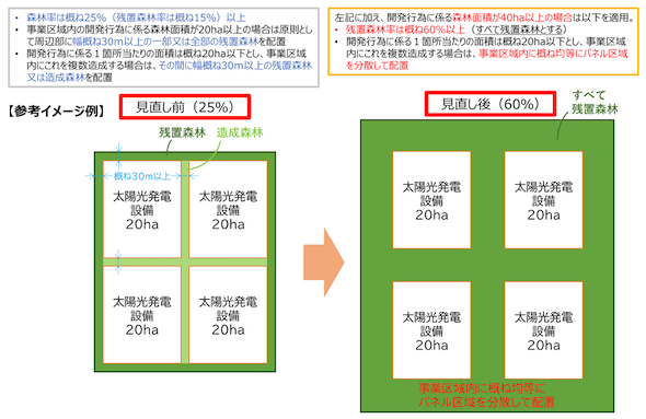 現在、太陽光発電については、「工場、事業場の設置」の基準を適用し、森林率は25%以上とすること、開発行為に係る森林の面積が20ha以上の場合は原則として周辺部に幅30m以上の残置森林又は造成森林を配置すること、及び開発行為に係る1箇所当たりの面積は20ha以下とし、複数造成する場合は、間に幅30m以上の残置森林又は造成森林を配置すること、としている(後述の図8を参照)。