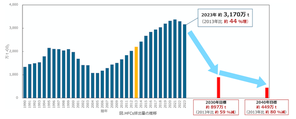 2023年度(現時点の最新確定値)におけるHFCsの排出量は約3,170万t(CO2換算)であり、日本全体のGHG排出量の約3%を占めている。HFCsの排出量は、オゾン層保護法に基づく規制等により2022年以降減少に転じたが、地球温暖化対策計画における2030年・2040年の削減目標の達成に向けて、まだ大きなギャップが残されている。なお図5の数値は、「地球温暖化対策計画」2025年2月策定時の目標値から、排出量の算定方法の見直しにより、変更されたものである。