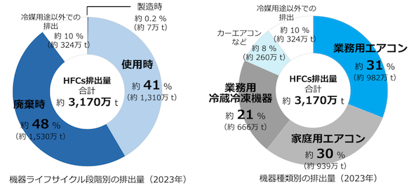 HFCs(代替フロン)排出量の機器の種類別内訳としては、業務用エアコンが約31%、家庭用エアコンが約30%と多く、次いで業務用冷蔵冷凍機器が約21%となっている。機器のライフサイクル段階別の内訳は、使用時が約41%、廃棄時が約48%となっている。これら機器種類別・ライフサイクル段階別の内訳をクロス集計すると、「家庭用エアコン・廃棄時」が最大の約23 %となっている。