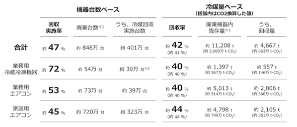 機器の廃棄時におけるHFCsの大気放出を避けるためには、HFCs使用機器を適切に回収し、冷媒を回収する必要がある。地球温暖化対策計画では、業務用エアコン・冷蔵冷凍機器廃棄時のHFCs回収率目標を、台数ベースで2025年に70%、2030年に85%、冷媒量ベースで2025年に60%、2030年に75%としているが、2024年の回収率実績は冷媒量ベースでは4割程度に留まる。
