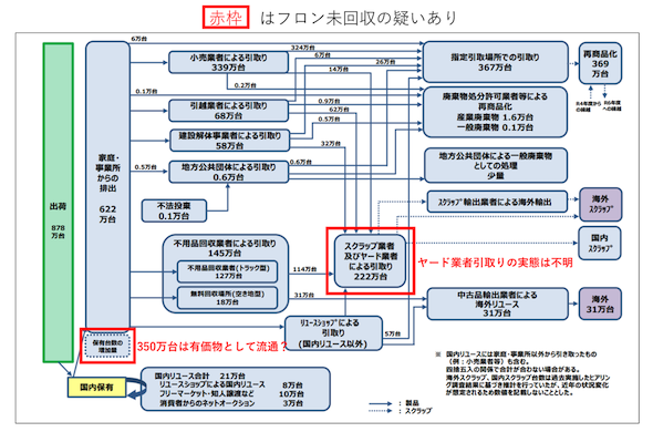家電リサイクル法において、小売業者は消費者からの家庭用エアコンの引取義務およびメーカー(指定引取場所)への引渡義務が課されている。ただし、図7のように廃棄エアコンのかなりの台数が冷媒フロンを回収せずに不適正に処分していると考えられている。