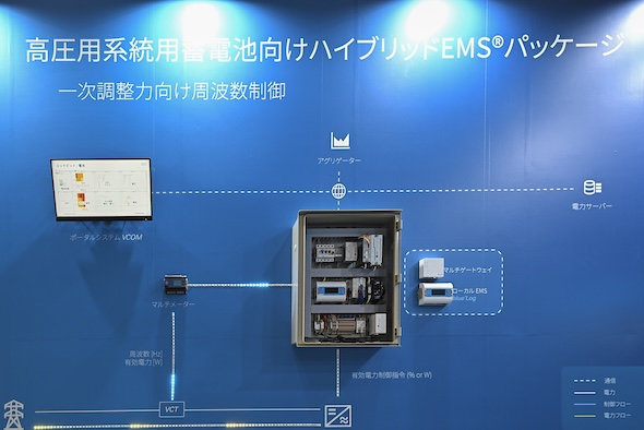 今回のブースでは、「蓄電池EMS」を前面に打ち出した。既存のハードウェア(ソーラーリンクゼロ)に蓄電池用ソフトウェアを組み込む形で提供されるローカルEMSで、アグリゲーターのサーバーから受け取った指令に従って蓄電池の充放電を制御する。需給調整市場に関しては、三次調整力・二次調整力に加え、2026年秋頃には一次調整力への対応も見込む。