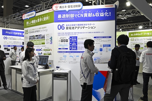 東芝は、系統用蓄電池のEPCから市場運用までをトータルに提供する。今回のブースでは「最適制御で収益最大化」をメインテーマに掲げ、ハードとソフト両面からのアプローチを披露した。