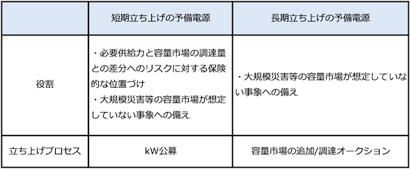 の2つの区分を設けており、これらに対応する立ち上げプロセスとしては、前者では主に「kW公募」を想定し、後者では「容量市場の追加オークションのうち調達オークション」を想定している。なお、予備電源はこれらの立ち上げプロセスに応札することが「リクワイアメント(義務)」とされており、順守しない場合には経済的ペナルティ(契約金額の年額の10%)が科される。