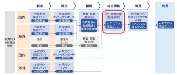 e-ガソリンのサプライチェーンは構築の途上であるが、合成原油またはe-ガソリンの形で輸入または国内製造され、主に国内の製油所等にて混合・成分調整されるケースが想定されている。