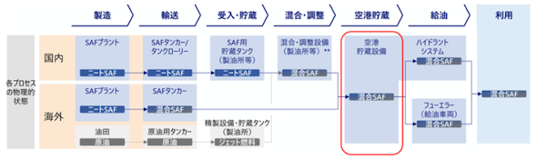 SAFのサプライチェーンとしては、国内でニートSAFを製造し、国内製油所等で混合するケースと、海外で混合された製品(混合SAF)を輸入し、空港に直接搬入するケースがある。航空機燃料税は、化石燃料/SAFの違いに関わらず課税される。
