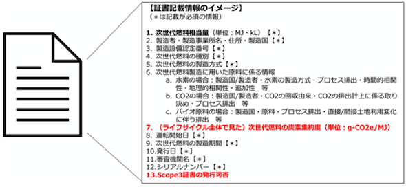 クリーン燃料証書には、製造された次世代燃料に係る基本的情報については記載を必須として、国際イニシアティブへの対応やScope 3排出算定、カーボンフットプリント算定需要を見据え、製造原料に係る情報も任意で記載可能とする。