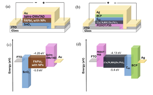 また、ワイドギャップセルに用いる順構造ペロブスカイト太陽電池を高効率化するための工夫も行った。あらかじめホットインジェクション法でFAPbI3ナノ粒子を合成し、これを種結晶にして順構造トップセルに用いるFAPbI3薄膜の性能を高め、ワイドギャップセルの変換効率を向上させている。