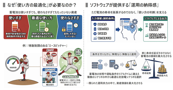 蓄電池は、充放電を繰り返すことで徐々に性能が低下し、長期的には運用可能な容量や期間が変化する。開発するソフトウェアは、こうした劣化の進行を踏まえた市場取引や充放電などの運用を行うことで、蓄電池の価値をより長く活用し、電池劣化を考慮した市場取引を実現するという。