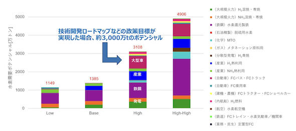 また、一般社団法人水素バリューチェーン推進協議会では、技術開発ロードマップなどの政策目標が実現した場合、2050年に約3,000万tの国内需要ポテンシャルがあると試算している。