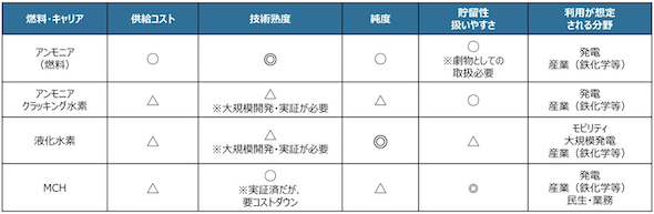 他方、水素の大量輸送技術(水素キャリア)については、大規模実証が完了せず投資実績が無いものや、熟度は十分であっても輸送を含む供給コストが高く、さらなる研究開発が必要なものもある。商用サプライチェーン構築にあたっては、技術熟度と今後の見込み、需給量のバランス、最終製品価格に占める燃料費の割合、物性の違いなども総合的に考慮する必要があると考えられている。