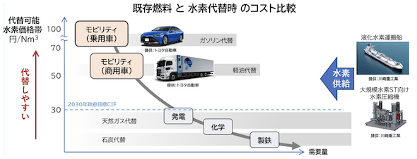 小型の乗用車と比べ、相対的に電動化が困難な大型の商用車(トラックやバス)では、水素を燃料とする燃料電池自動車(FCV)の普及が進められている。また、発電や産業分野と比べ、モビリティ分野はコスト面で相対的に水素への転換が進めやすい。そのため同分野を起点に水素の社会実装を進めることが検討されている。