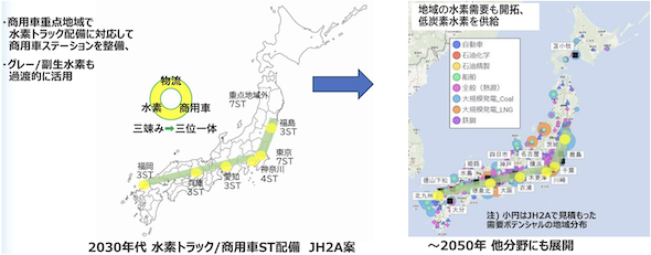 国は、産業界もコミットする「水素大動脈構想」の実現に向け、今後10年程度で、重点地域を中心に大規模水素ステーションの整備など、大型トラック等のFC商用車集中投入支援により、需要の塊を創出し、官民一体で社会実装を加速化するとしている。