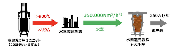 水電解装置を用いた国産水素製造のための電源として、まずは再エネの活用が想定されるが、次世代原子力の一つである高温ガス炉では、その高温熱(900℃程度)を利用して準国産水素が製造可能である。高温ガス炉1ユニット(200MWt×5炉心)で、商用規模の水素還元製鉄シャフト炉1基に必要な水素(35万Nm3/h)を供給可能と報告されている。