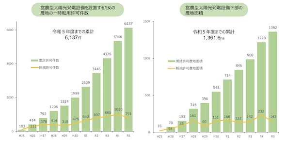 このため、営農型太陽光発電設備を設置するための農地の一時転用許可件数は、令和5(2023)年度までに6,137件、その発電設備下部の農地面積は1,362haへと増加が続いている。