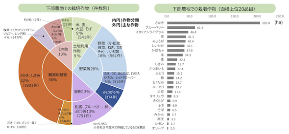 営農型太陽光発電設備の下部農地での栽培作物の分類をみると、件数ベースでは榊(さかき)等の観賞用植物が36%(2,147件)と最も多く、太陽光パネルにより遮光することを前提とした特徴的な作物が多く栽培されている。