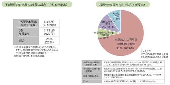 営農型太陽光発電設備の下部農地での営農に支障があったものの割合は、令和5年度末において24%(1,221件)となっており、前年度と比較して2%上昇(294件増)した。支障の内容をみると、単収減少・生育不良(営農者に起因するもの)が71%(872件)となっており、このようなケースに対しては、農地転用許可権者が改善措置を講ずるよう指導を行っている。