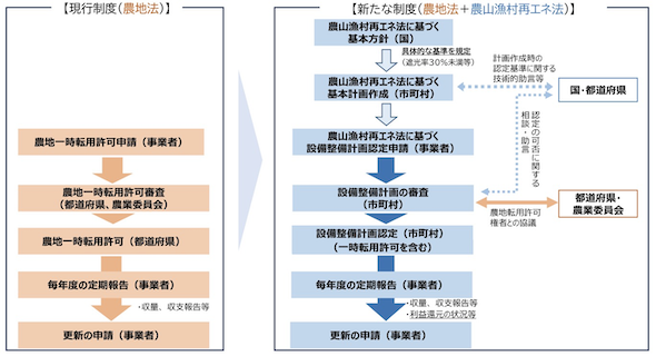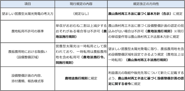 具体的には、「望ましい営農型太陽光発電の考え方」を農山漁村再エネ法に基づく基本方針に明記し、望ましい営農型太陽光発電に適合することについて、農山漁村再エネ法に基づく認定を受けることを一時転用許可の条件として位置づける。