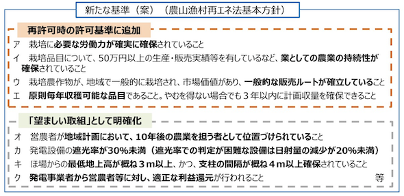 法の不遡及の原則等を踏まえ、既存事業者に対しては現在の基準を適用することが基本となるが、農山漁村再エネ法の改正基本方針案に盛り込まれた新たな基準案の一部は、一時転用の再許可(更新)時の許可基準に追加する方針が示された。一時転用期間は原則3年以内(一定条件を満たす場合は10年以内)であるため、既存事業者へも次第に新たな基準の適用が進むと考えられる。なお、その他の基準は「望ましい取り組み」という位置づけである。