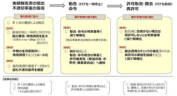 また、国も農地一時転用の許可権者等(都道府県・市町村・農業委員会)と一体となって、不適切事案への取締りに関与するため、国の審査/現地調査の対象の下部農地面積を4haから2haに引き下げるなどにより、国の対応を強化することとした。