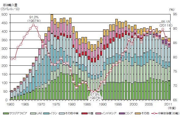 中東に強く依存した構造はリスク要因だ。政府の認識も同じであり、1967年に依存度が9割を超えたのち、1987年には7割以下にまで引き下げることに成功した。しかし、2011年度には再び85.1%まで上昇している(図2)。アジア最大の原油産出国の中国、2番目のインドネシアからの輸入量がそれぞれ減ったことが効いている。どちらの国も経済成長の結果、現在は原油の純輸入国だ。両国に変わる輸入先が必要だ。