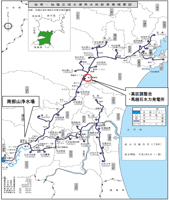 なお、仙南・仙塩広域水道は、阿武隈川水系の白石川七ヶ宿ダム(宮城県七ヶ宿町)で取水し、南部山浄水場(宮城円白石市)を経由する。その一部が高区調整池に至る形だ(図4)。