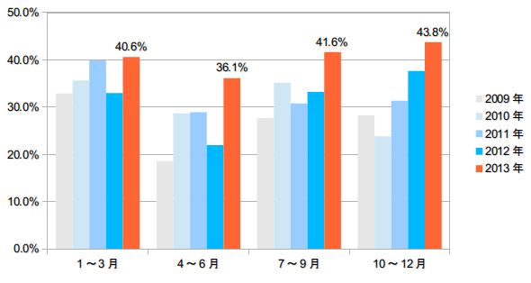 既築住宅向けの落ち込みを別の角度から見たのが図3だ。図3は受付件数に占める新築住宅の割合を示したもの。2013年はいずれの四半期も新築住宅の割合が過去最高になっている。10〜12月は43.8%だ。