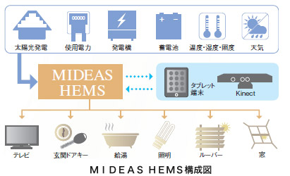2014年7月のリニューアルで追加された実証実験の内容は3つある。MIDEASが備える家庭用エネルギー管理システムMIDEAS HEMSが中核となった実証実験だ。
