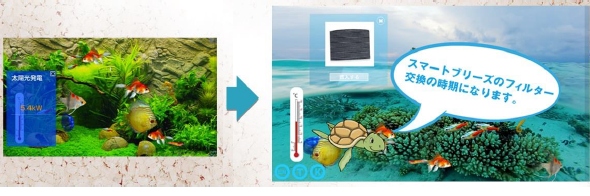 第2は「タッチユーザーインタフェース」だ(図7)。「これまでもHEMSの情報を数値やグラフでなく、水槽(アクアリウム)の魚の数や種類で表すといった工夫を凝らしていた。しかし、表示はテレビ画面上に限られていた。新たに、テレビの反対側の壁面に小さなタッチモニターを配置した他、スマートフォンやタブレット端末から操作できるようにした」(三井ホーム)。スマートフォンなどに対応したことにより、特定の機能をアプリ(アプリケーション)として追加していく仕組みを作った。例えば、照明や窓を操作するアプリ、さらに映画鑑賞に適した照明に変えるアプリなど、ユーザーの使い方に応じてアプリを選んでインストールすることが可能になっていく。
