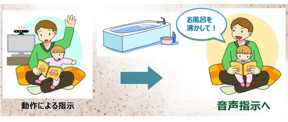 第1の新実験は、「ナチュラルユーザーインタフェース Kinect(キネクト)」の機能向上だ(図6)*6)。これまでの実証実験では手を振る操作で窓やブラインドを開閉する、浴槽へ湯張りするなどの命令を実行できた。「今回は音声によるコマンド実行機能を加えた。照明をつける操作に『部屋を明るく』という音声を結び付けて登録できる。照明の入り切りや窓の開閉、カーテン開閉、扇風機のオンオフなどを実行可能だ」(三井ホーム)。MIDEAS HEMSとKinect、家電を連携することで実現した。