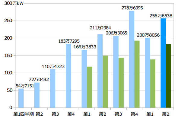 太陽電池モジュールの総出荷量は256万6538kW(約2.6GW)であり、これは前年同四半期の1.21倍に相当する(図1)*2)。前期比では1.28倍だ。第1四半期は大きく落ち込んだものの、第2四半期で回復した形である。