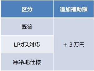 さらに寒冷地仕様とLPガス対応の製品に対しては3万円の補助金を追加する。工事費が多くかかる既築の住宅に設置する場合も3万円の追加補助が付く(図6)。それぞれ重複して適用できるため、既築の住宅に寒冷地仕様でLPガス対応のPEFCを導入すると、基準価格以下であれば最高24万円の補助金が出る。