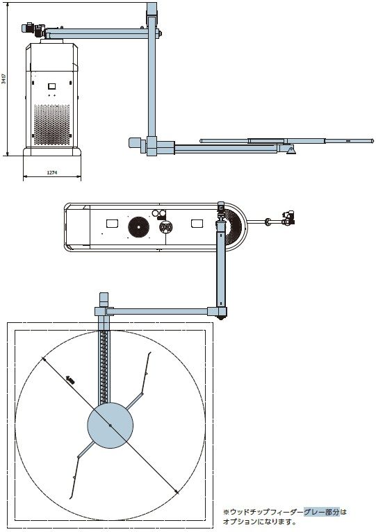Volter 40には木質チップを自動的に供給するフィーダー(燃料供給装置)をオプションで付けることができる。フィーダーの先端の回転部分が木質チップをかき集めて、パイプを通じて発電装置の上部から送り込む方式である(図6)。