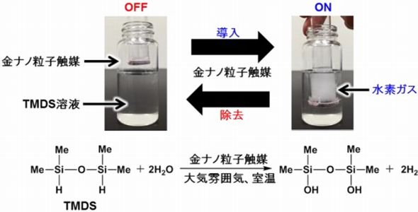 有機化合物は工業用のシリコーンを製造する時に生じる副産物で「ヒドロラシン類」と呼ばれている。安価に大量に入手できるうえに、大気中でも安定している点が特徴だ。ヒドロラシン類の溶液の中に、金ナノ粒子を付着させた触媒を入れると水素ガスを発生する(図2)。