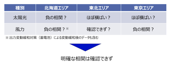 VRE導入量と時間内変動の相関についてまとめたものが表1であり、現時点では明確な相関は確認できない(つまり、平滑化効果は確認できない)と結論づけられている。