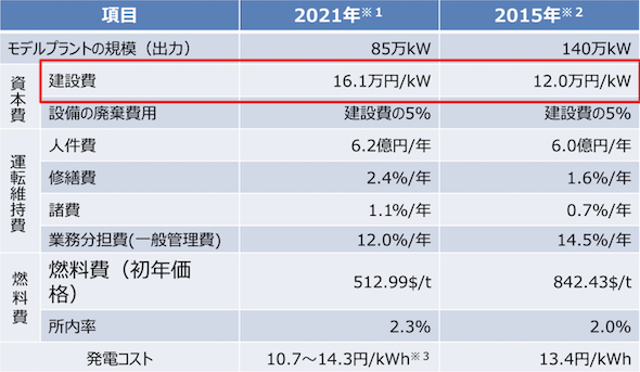 ところが2021年の発電コスト検証WGでは発電コストが見直され、特に建設費が大きく上昇している。