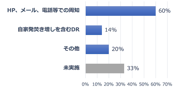 需給逼迫警報発令の単純な連絡やこれに伴う節電のお願いが最多であり、何も実施しなかった小売事業者も3割程度存在する。