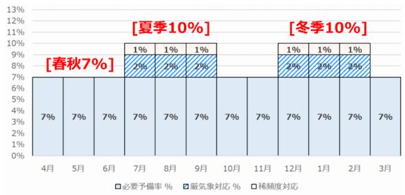 現在の供給信頼度評価の基準(0.048kWh/kW・年)は、夏季・冬季のみ厳気象対応(2%)と稀頻度リスク対応(1%)を考慮したH3需要の予備率10%と算定しているのに対して、春季・秋季はH3需要要の7%のみが考慮されている。