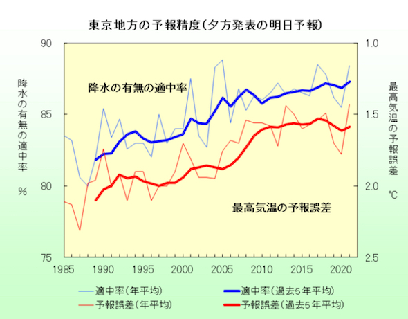 ところが気象庁によると、関東甲信地方の翌日最高気温予想の平均的な誤差(RMSE:二乗平均平方根誤差)は、過去20年平均で1.9℃、(漸進的に改善が進み、直近の2021年は1.5℃)と報告されている。