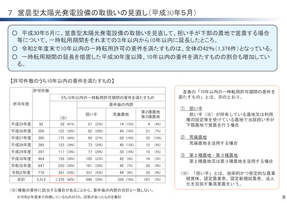 こちらは、10年以内の一時転用許可が認められる条件を満たす案件の状況を集計したデータで、令和2年度はその比率が大きく増加しています。この制度見直しが行われてから計画された事業が多くなってきた時期になるため、今後もこの状況は続いていくと考えられます。