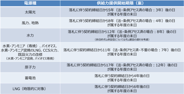具体的な供給力提供開始期限は、電源種ごとの建設リードタイムの実態を踏まえるとともに、「X年後の日」ではなく、案件管理単純化のため「X年後の日が属する年度の末日(3月31日)」と設定されている。