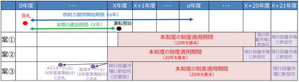 これはあくまで開始期限であるため、図6のように、現実の運転開始日(供給力提供開始日)は開始期限(α年度)よりも早いX年度の途中であることが一般的と予想される。このとき、本制度の制度適用期間(20年)の始期をどうするかということが論点となる。