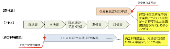 環境アセス対象となる風力・地熱発電ではこの例外措置を参考として、FIT/FIP認定後に土地開発許認可取得を認めるものとする。ただしFIT/FIP認定から3年以内に許認可を取得しない場合、その認定は取り消しされる。