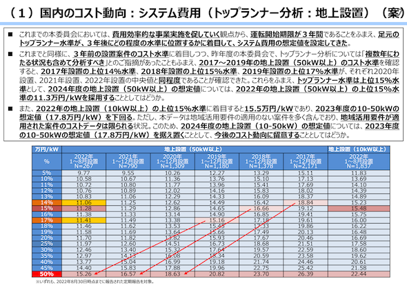 しかし、そもそもFITの調達価格は下記の第82回調達価格等算定委員会における資料に見られるように、トップランナー水準の費用が概ね3年先における一般的なシステム費用になるという見通しを勘案して決定されているはずです。従って、発電事業者からすると事業計画認定取得後速やかに運転開始をするのではなく、一定の期間経過後を目処として事業化することに経済的な合理性があります。そうした実態が分からないというのは、調達価格等算定委員会の委員に事業者が含まれていないことによる現場意識との乖離と言えるでしょう。