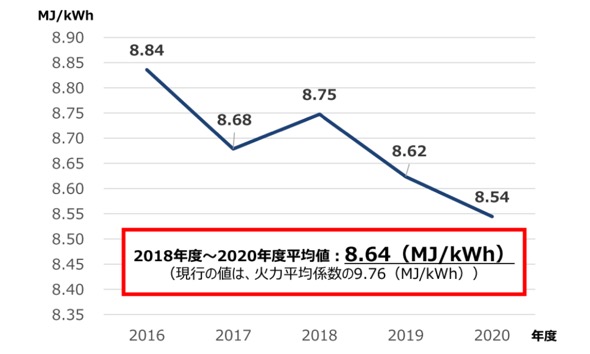 再エネ等の非化石電源の増加により、現実との乖離が大きくなることが懸念されるため、改正省エネ法では、全電源平均係数で算定することに変更された。具体的には、直近3年間(2018年度〜2020年度)の平均値8.64MJ/kWhを用いることとして、これは従来と比べ約11%小さい係数となる。