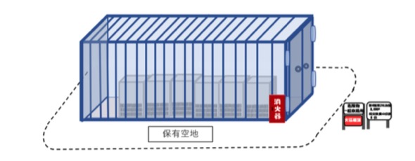 - リチウムイオン蓄電池設備は、キュービクル式のもの、または厚さ1.6mm以上の鋼板で造られた専用の箱(コンテナ)に収納されていること。
