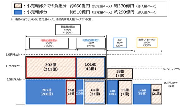 仮に他の電源がこれを負担するとした場合、他の電源の費用負担が大きくなり、電源間での競争に多大な影響を与える恐れがある。このため既認定FIT/FIP電源の減免分は、従来制度と同様に、小売電気事業者を通じた需要側の託送料金で負担することとした。